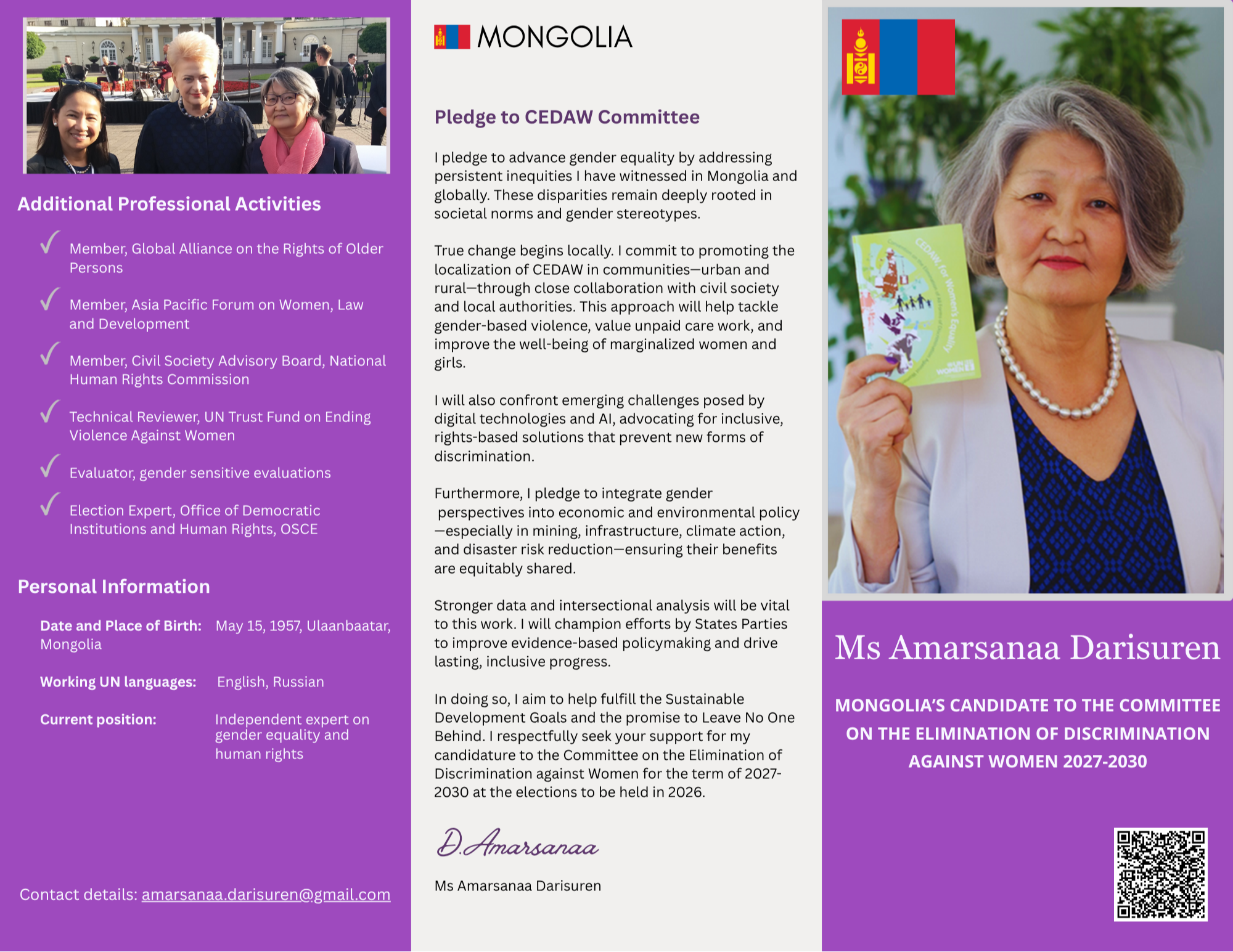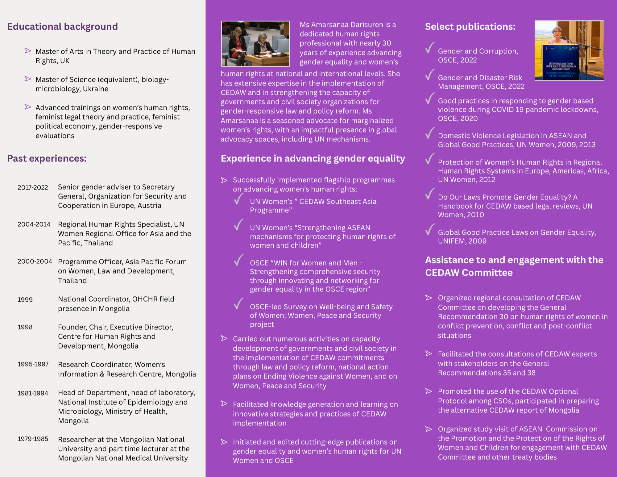 Дарьсүрэнгийн Амарсанаа нь үндэсний, бүс нутгийн болон олон улсын хэмжээнд эмэгтэйчүүдийн эрх болон жендэрийн тэгш байдлыг сайжруулах чиглэлээр 30 гаруй жилийн туршлагатай хараат бус шинжээч билээ. Тэрээр Монгол Улсаас НҮБ-ын Эмэгтэйчүүдийг ялгаварлан гадуурхах явдлын эсрэг хороонд 2027-2030 онд ажиллахаар нэр дэвшиж байна. Ингээд түүний ажил мэргэжлийн туршлагыг та бүхэнтэй хуваалцаж байна.