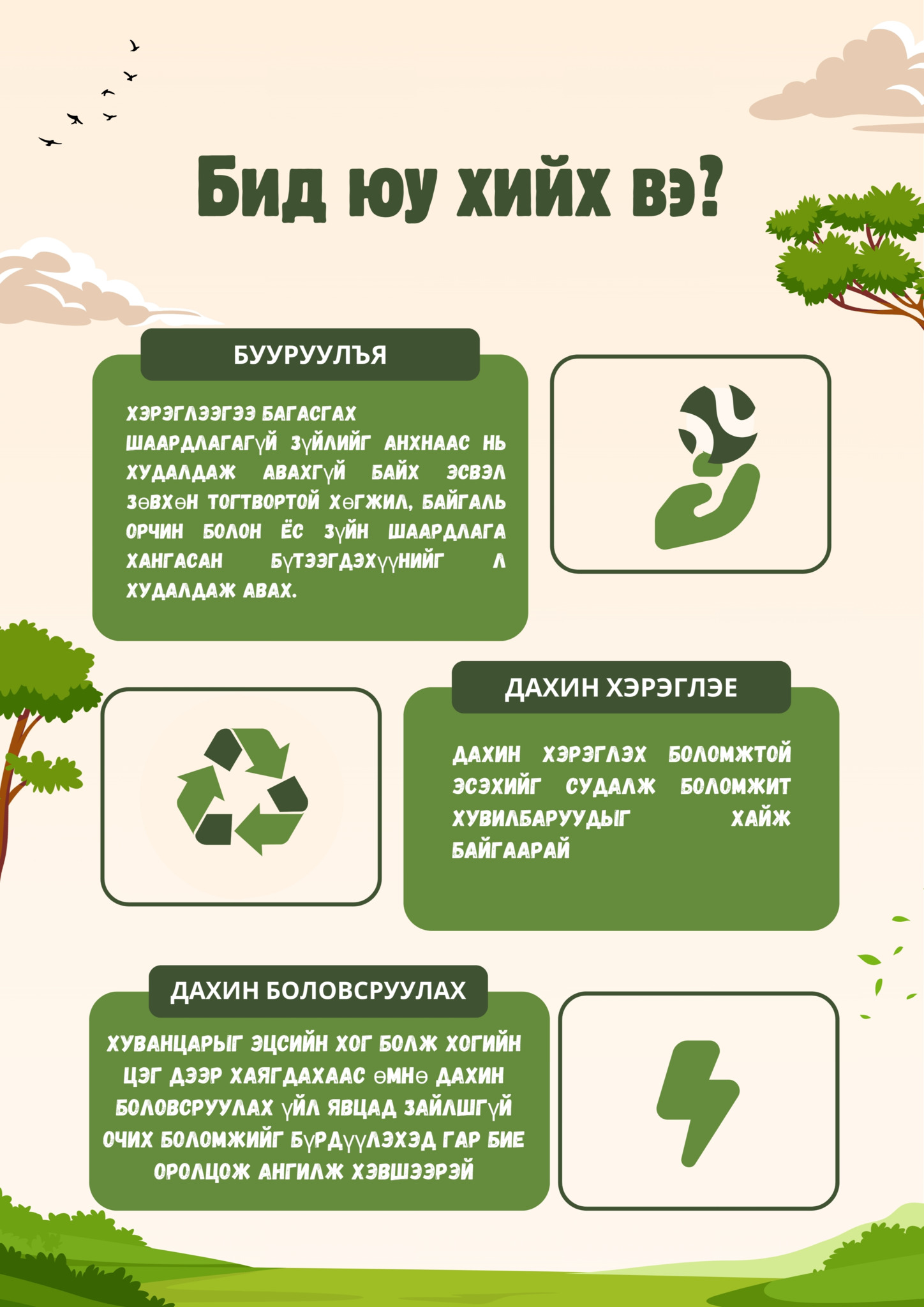 Монгол улс Үндсэн хуулиндаа Байгаль орчноо хамгаалах нь иргэн бүрийн журамт үүрэг хэмээн тунхаглан баталгаажуулсан байдаг. Тэгвэл энэ л журамт үүргээ биелүүлж ажил болоод амьдралынхаа хэвшилд хуванцарын хэрэглээ ба ангилан ялгах үйл явцыг нэвтрүүлээд буй Энхзул бүсгүйн ажилтай танилцлаа. Тэрээр БЗД-ийн 16 дугаар хорооны Зохион байгуулагч бөгөөд хуванцар дахин боловсруулагч “Ти Эм Эл Пластик” үйлдвэртэй жил гаруйн өмнөөс хамтран ажиллаж эхэлжээ.