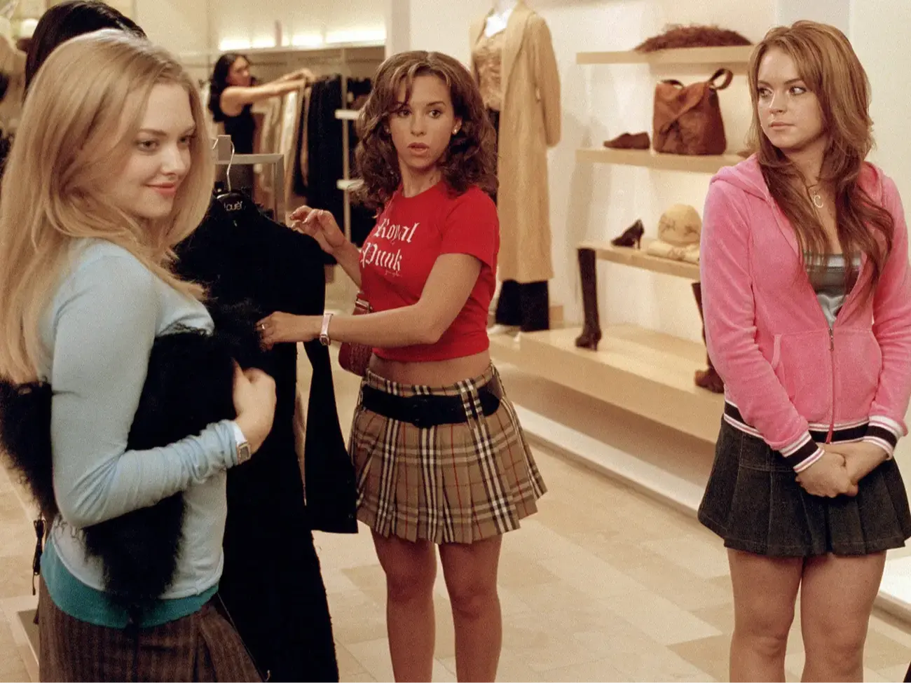 Үүнтэй эсрэгцэн Режина охидын бүлгэмийн дарга гэлтэй ягаан сорочка дээр хар гурвалжин энгэртэй цамц давхарлан өмссөн харагдана. Ягаан өнгө нь Режинагийн хээнцэр охин чанарыг нь тодотгож байгаа бол дээгүүр нь өмссөн хар гурвалжин энгэртэй цамц нь зүгээр ч нэг охин биш дарга дарангуйлагчийн байр суурийг давхар илтгэж байна. Үүнээс гадна Кэди яг л ажлын ярилцлага юмуу байцаалтанд орж байгаа юм шиг хуванцар охидын өөдөөс нь харан сууж байгаа нь киноны өгүүлэмжинд зөвхөн диалог, жүжиглэлт бус дүрүүдийн хувцаслалт төдийгүй байрлал нь ч ямар чухал үүрэгтэйг харуулж байгаа биз. За тэгээд Хэллоуины үдэшлэгт Кэди юу өмсч ирсэнийг санаж байна уу…