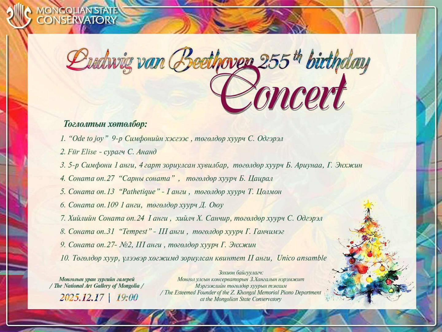 Германы суут хөгжмийн зохиолч Людвиг Ван Бетховены мэндэлсний 255 жилийн ойг тохиолдуулан З.Хангалын нэрэмжит мэргэжлийн төгөлдөр хуурын тэнхимээс төгөлдөр хуур, цөөхүүл хөгжмийн тоглолтыг 2025 оны 12 дугаар сарын 17-ны лхагва гарагт төгөлдөр хуур, цөөхүүл хөгжмийн тоглолтыг хийнэ. Бетховены төгөлдөр хуурт зориулсан чухалд тооцогддог сонатуудаас болон хийл төгөлдөр хуур, үлээвэр хөгжимтэй хамтарсан зохиолууд тоглогдоно.