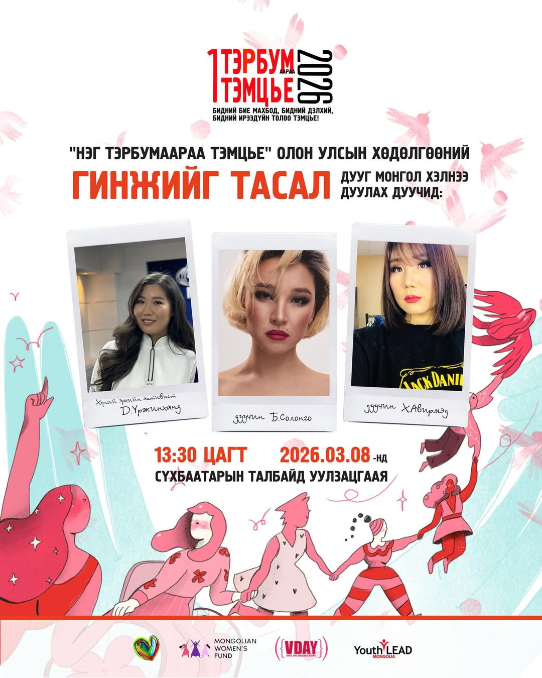 НЭГ ТЭРБУМААРАА ТЭМЦЬЕ 2026 – “ЭМЭГТЭЙЧҮҮДИЙН ЭРХ ЧӨЛӨӨНИЙ ТӨЛӨӨ АЛХАЛТ" 2026 оны 3 сарын 8-нд 13:30 цагт Сүхбаатарын талбайд зохион байгуулагдана. Охид, эмэгтэйчүүдийн эрхийн төлөөх тус алхалтад дуу хоолой, эв санаагаа илэрхийлж хамтдаа оролцохыг уриалж байна.